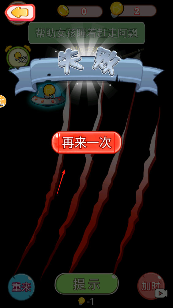 4、如果游戏失败,点击“重来”按钮重新开始当前关卡,再次挑战。