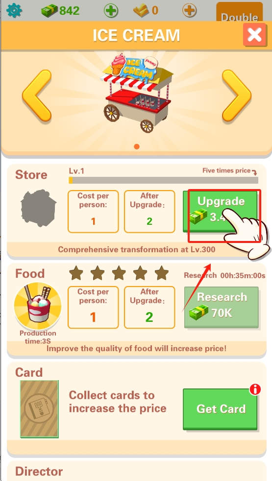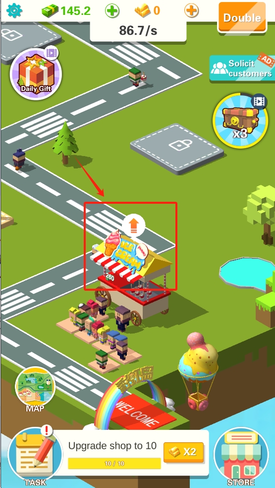基础经营:点击升级店铺设施,调整菜单定价,吸引更多顾客。合理分配金币,优先提升高收益店铺。