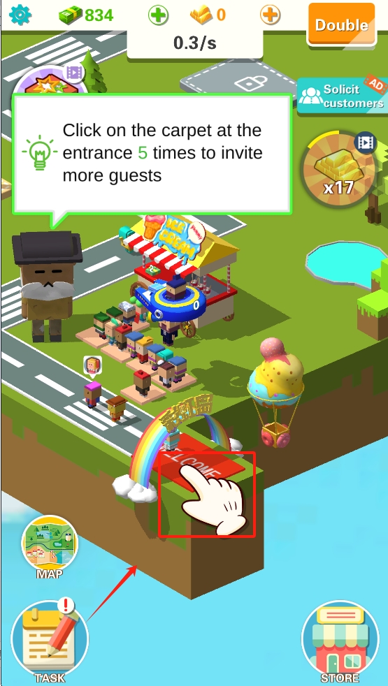 3、点击游戏界面中的加速按钮,完成店铺的升级任务,提升店铺的吸引力。