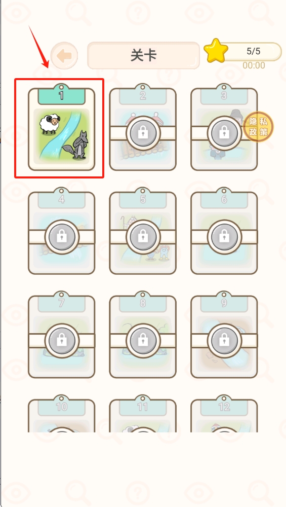 2、选择"第一关"按钮,进入游戏,开始闯关。