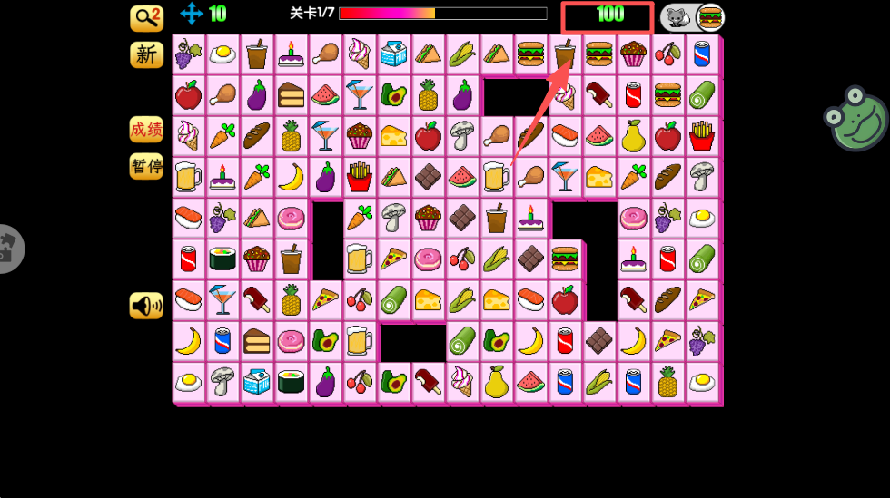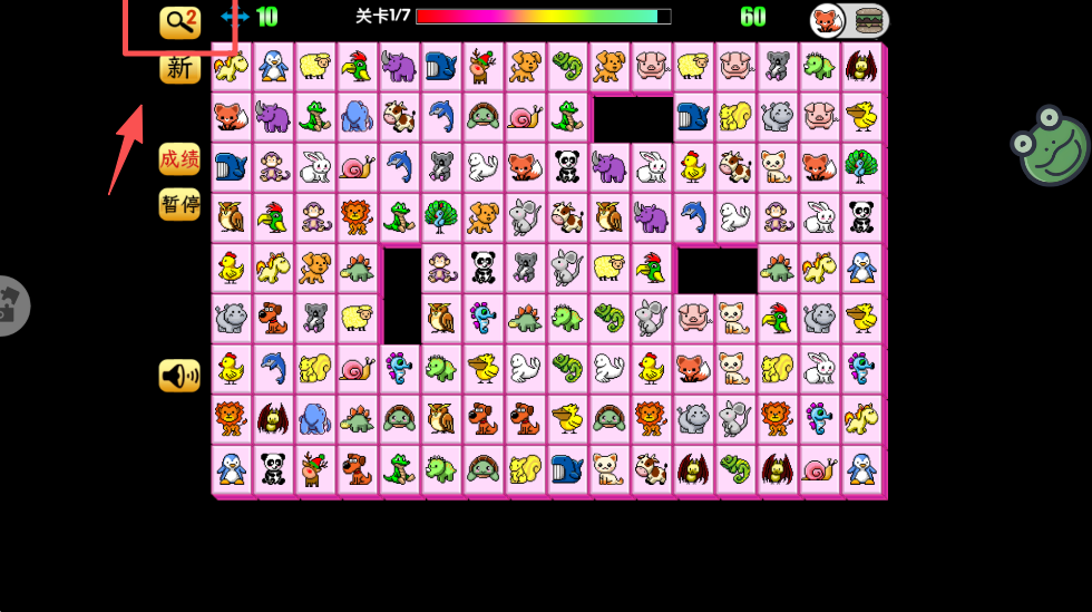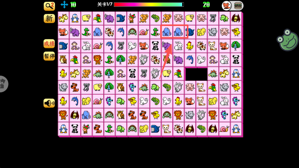 2、在游戏界面中,点击两个相同的动物图案进行消除,积累分数。