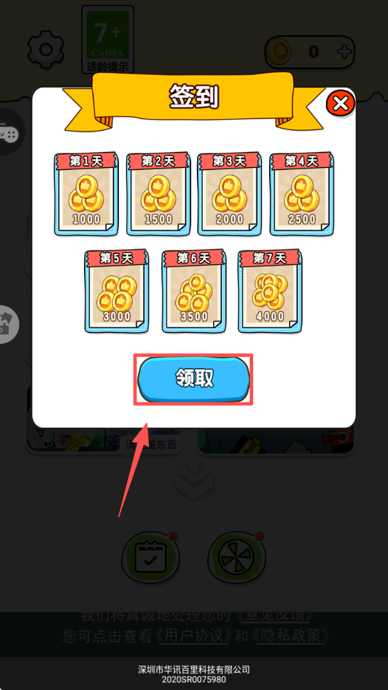2、查看签到奖励并点击“领取”按钮。每日签到可以获取金币奖励。
