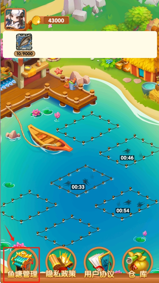 2、在鱼塘地图界面,点击左下角的鱼塘管理按钮,进入管理界面。