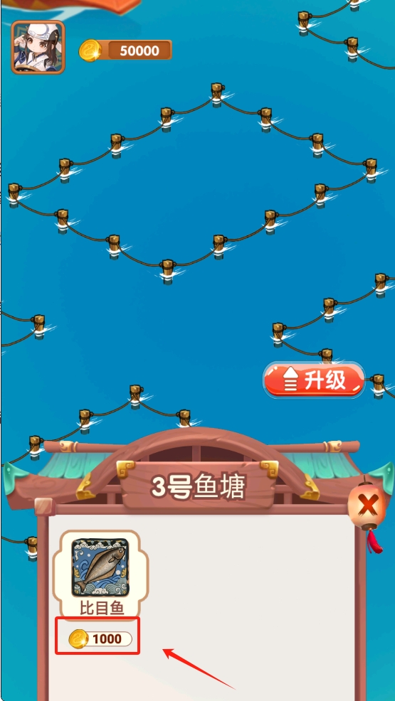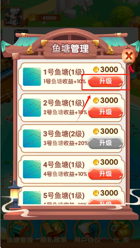 3、在鱼塘管理界面,选择鱼塘点击升级按钮,提升鱼塘等级。