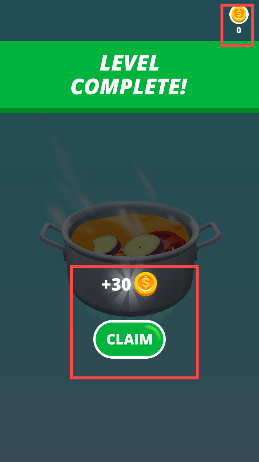 3、完成关卡显示【LEVELCOMPLETE!】后,点击【CLAIM】领取+30金币奖励,关注金币数量变化。