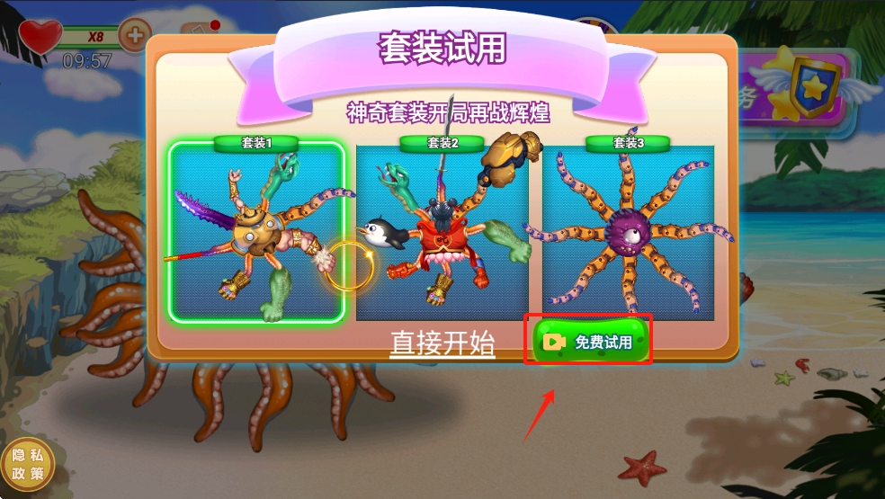 3、在套装试用界面,选择一个套装点击“免费试用”开始游戏。