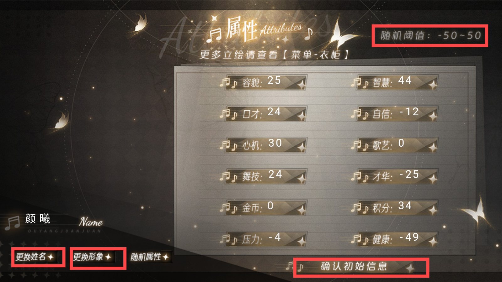 2、按玩家喜好可【更换姓名】和【更换形象】,修改个人属性后点击【确认初始信息】。