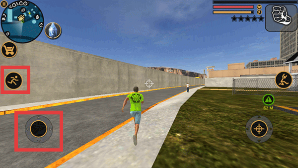 1、进入游戏界面,移动摇杆可以让角色行走,点击奔跑按键可以加快移动速度。