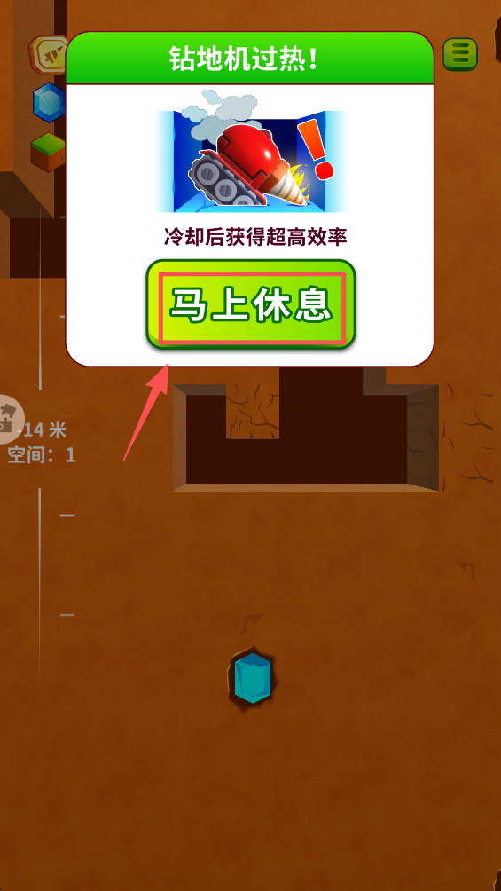 4、在挖掘过程中,如果钻地机过热,会出现警告提示,点击“马上休息”让钻地机冷却。