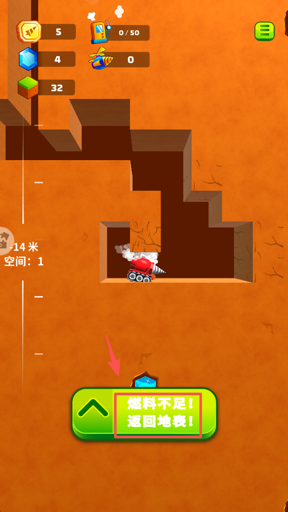 3、当燃料不足时,会出现提示,此时需点击界面上的“返回地表”按钮,以避免游戏失败。