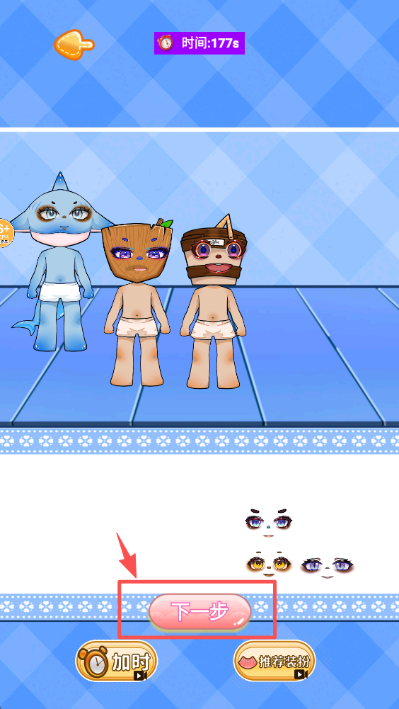 3、然后,点击“下一步”按钮,继续选择其他装扮元素,如服装和配饰。