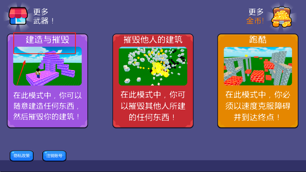 3、了解不同模式的玩法,选择“建造与摧毁“进行游戏。