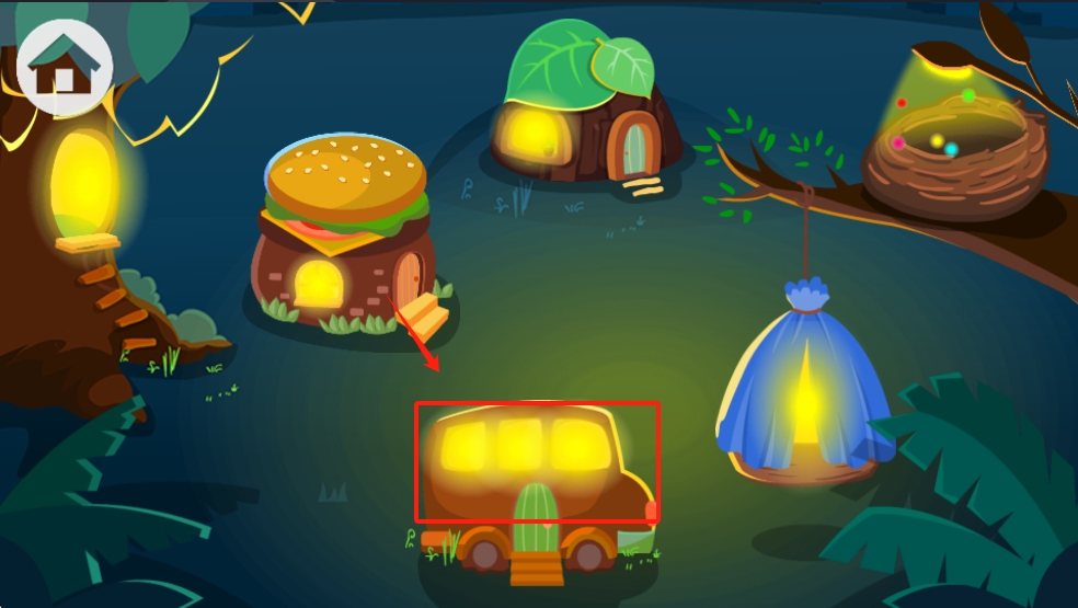 1、观察场景中的发光物体,如汉堡屋和蘑菇屋,点击它们进行互动。