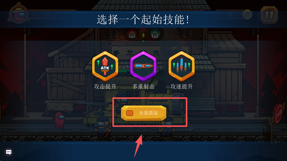 2、接着,在技能选择界面点击“全部获取”按钮,获取所有起始技能,为战斗做好准备。