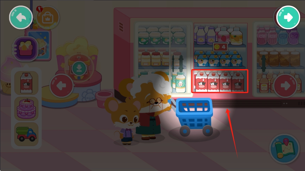 3、点击货架上的牛奶,将其加入购物车,完成商品的选购。