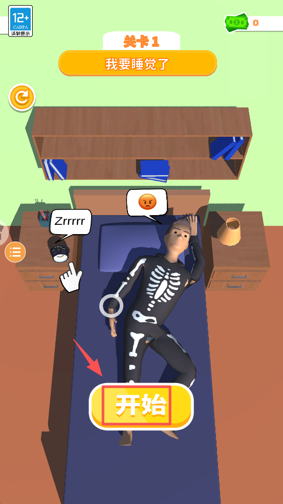 1、点击“开始”按钮,进入游戏关卡,准备开始你的睡姿挑战。