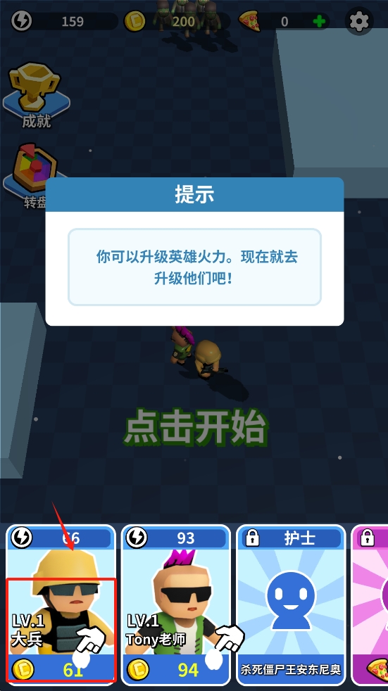 2、游戏中点击屏幕上方敌人,控制角色攻击,消灭敌人。