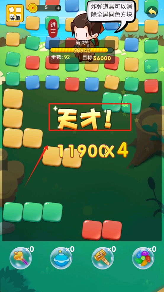 3、巧妙利用关卡中出现的特殊道具和生成的特殊元素,如爆炸特效、彩虹万能块,能事半功倍,高效完成高难度任务。