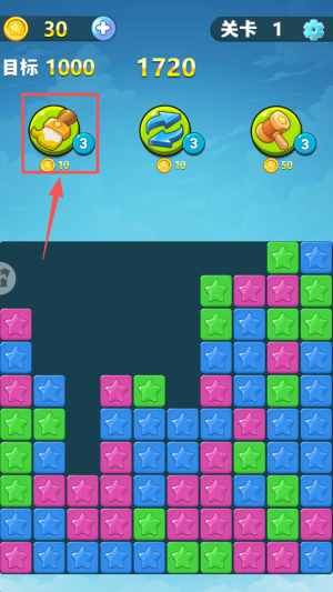 3、使用道具帮助达成目标,如使用炸弹道具清除大量星星。