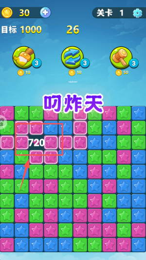 2、通过交换相邻星星位置,组成三个或以上同色星星实现消除。