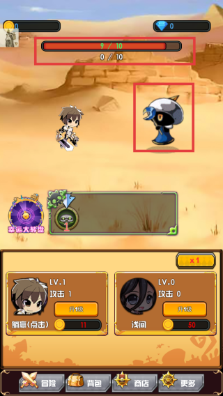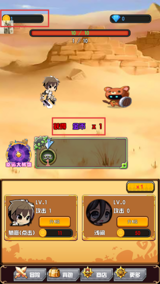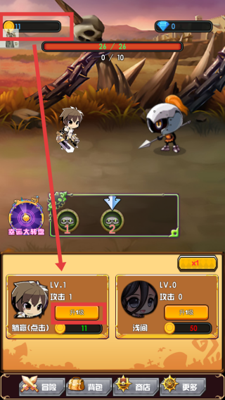 3、当金币攒到11时,可以点击【升1级】,提高角色攻击力。