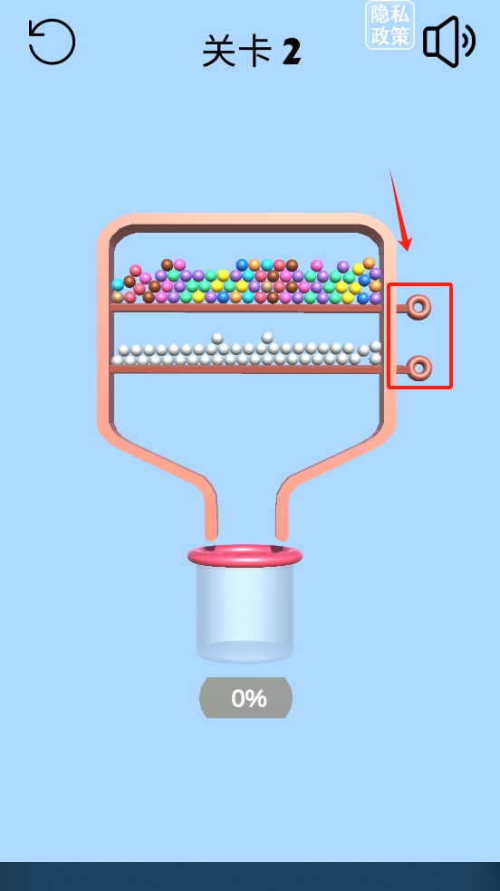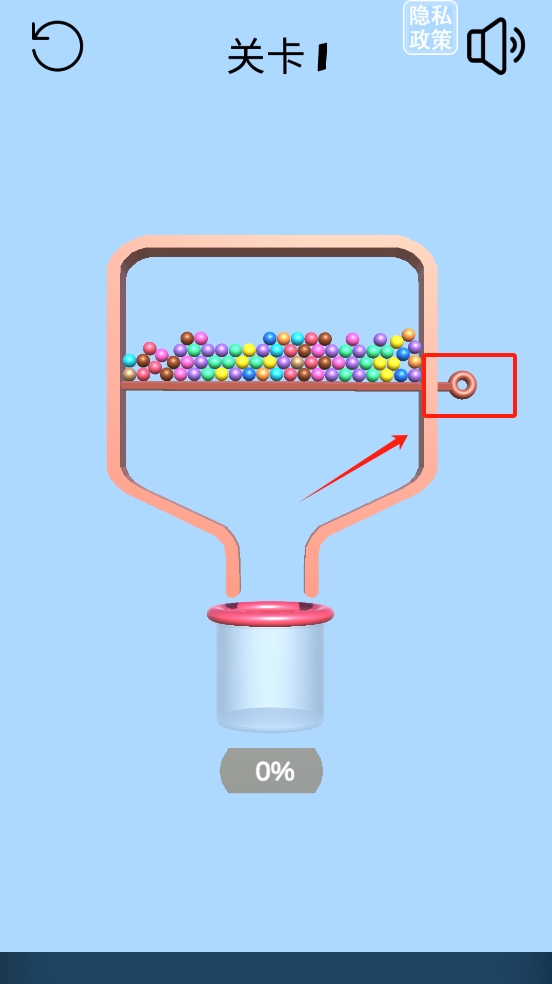 3、点击旋转阀门并拔掉,开始关卡2,让小球落入容器。