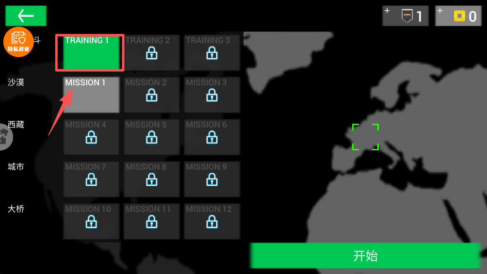 2、在任务选择界面,点击“TRAINING 1”开始训练任务。
