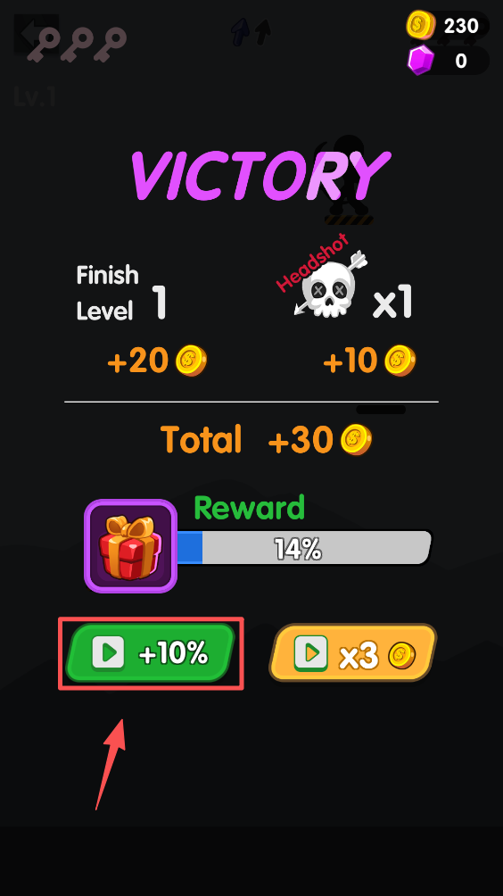 4、完成关卡后,点击“+10%”按钮,获取额外奖励。