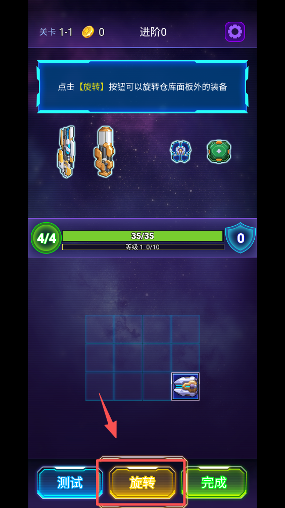 4、点击“旋转”按钮,将装备旋转到仓库面板外,完成装备配置。