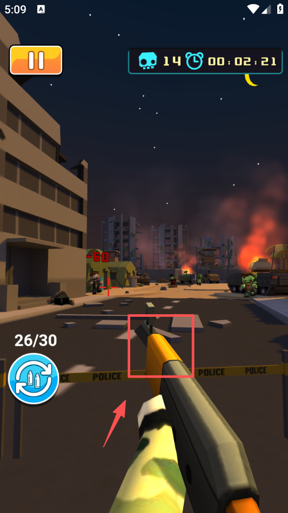 4、在游戏中,点击武器图标攻击敌人,成功抵挡汹涌的僵尸大军。