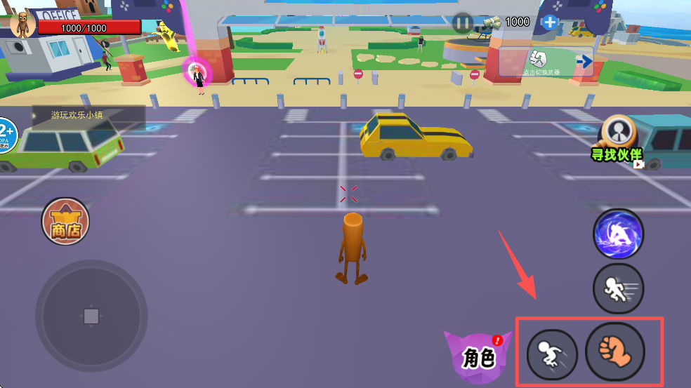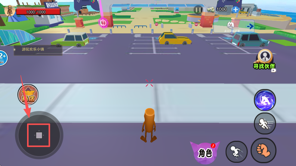 2、在游戏地图上,使用虚拟摇杆控制角色移动,探索欢乐小镇的各个角落。