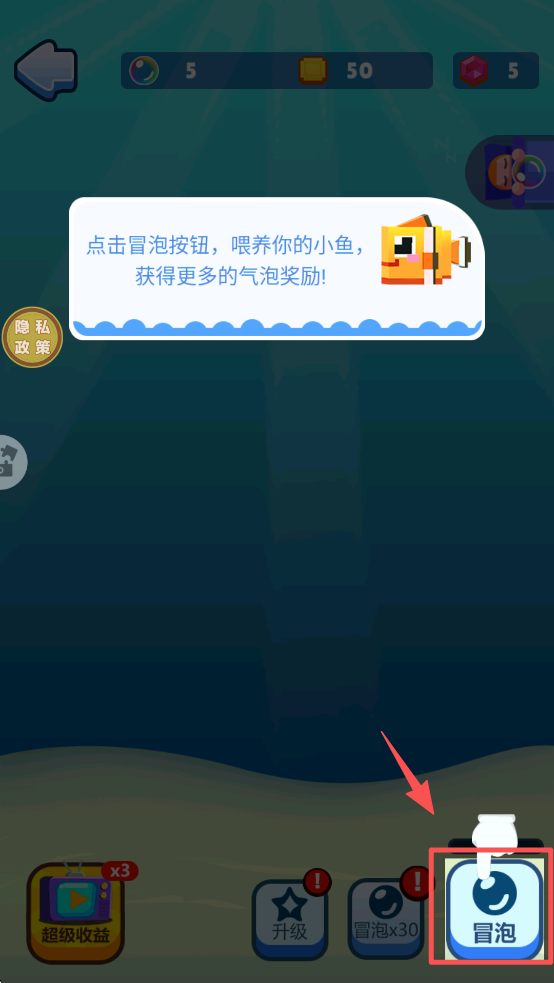 3、在游戏过程中,点击“冒泡”按钮,喂养您的小鱼,获取更多气泡奖励。