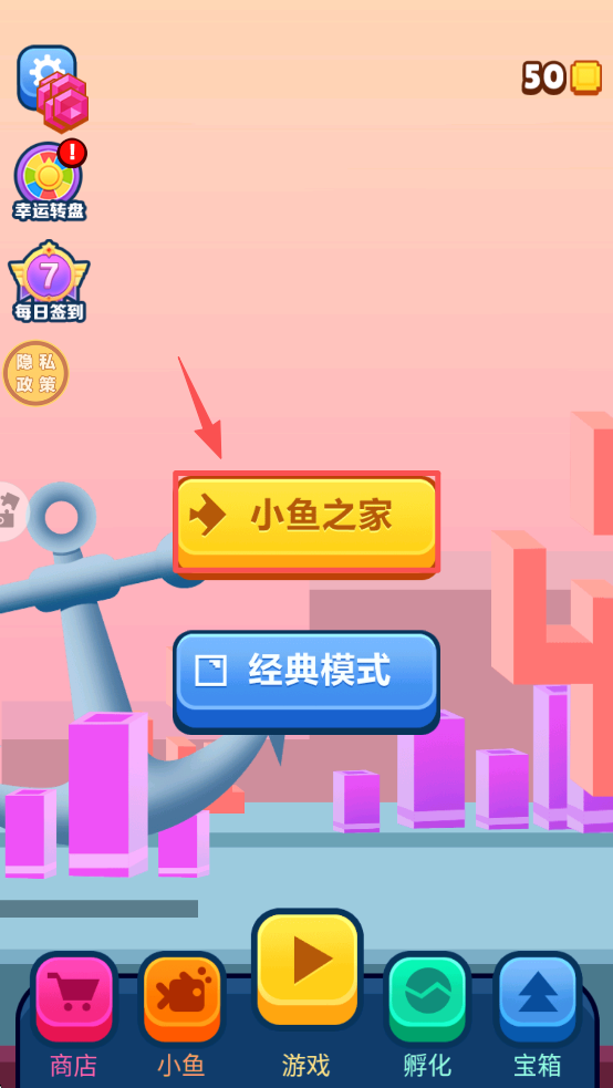 2、在游戏主界面点击“小鱼之家”按钮,选择模式,开始您的水下冒险。