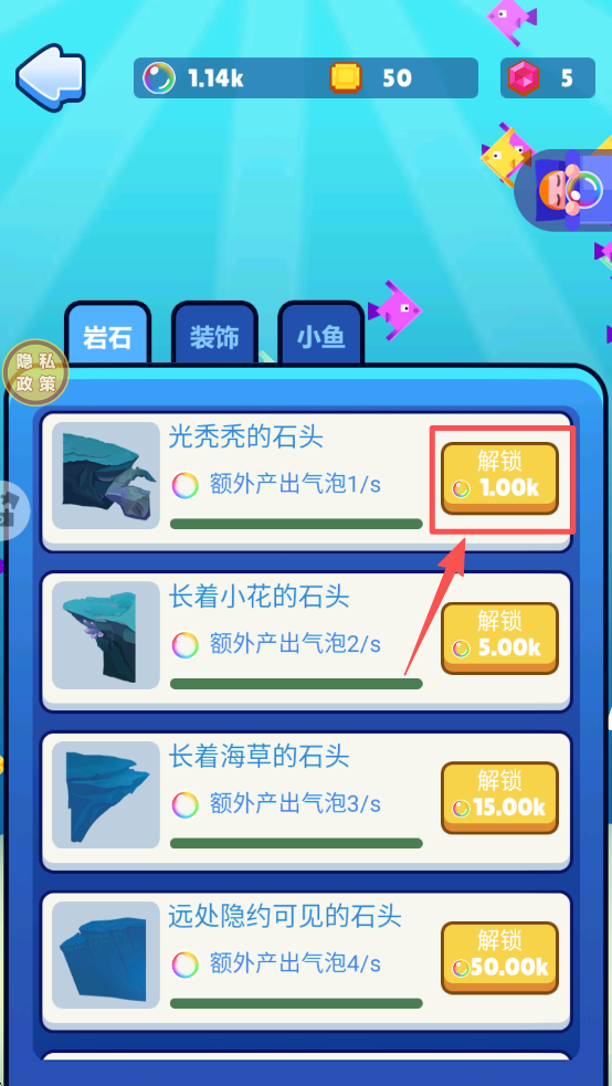 4、在商店界面,点击“解锁”按钮,购买并解锁新的装饰物品,美化您的海底世界。