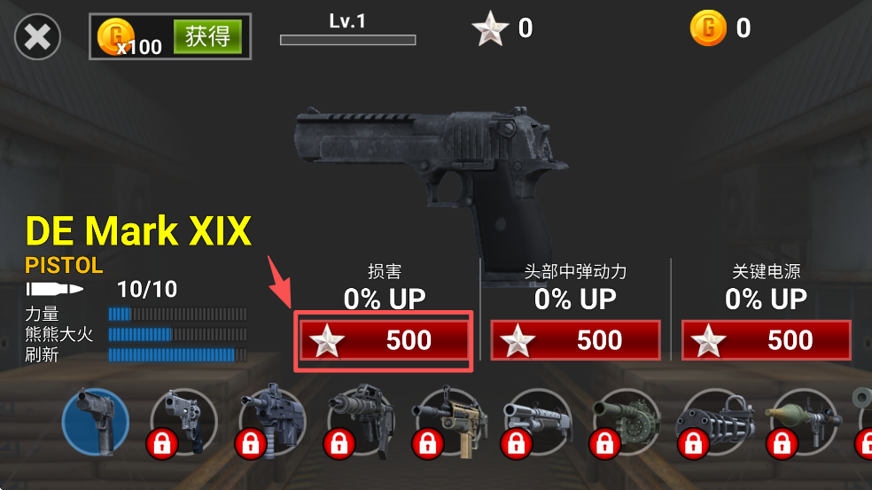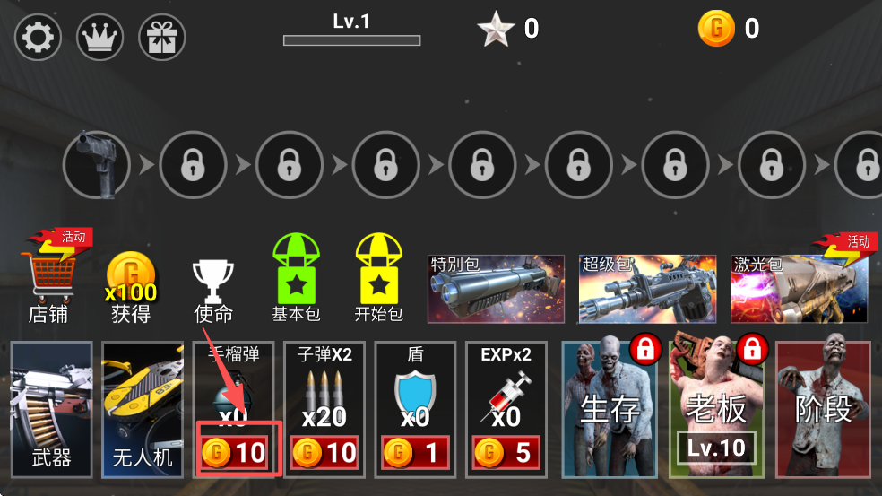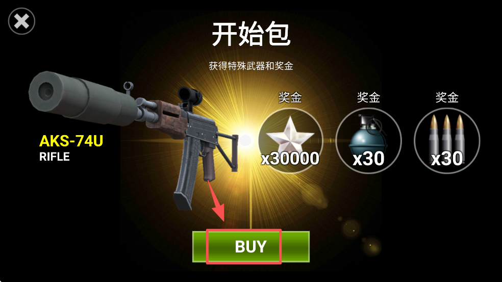 4、点击“BUY”按钮,购买开始包,获取特殊武器和奖金,准备进入战斗。