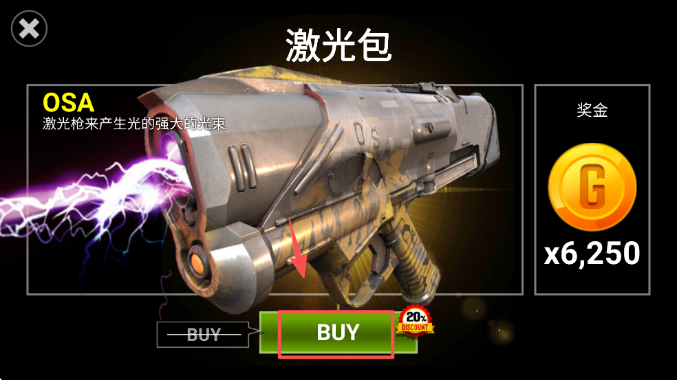 1、点击“BUY”按钮,花费6,250金币购买激光包,增强你的武器库。