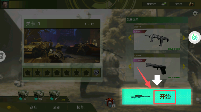 1、在关卡选择界面,点击 “开始” 按钮,进入游戏。
