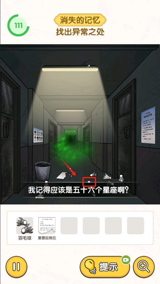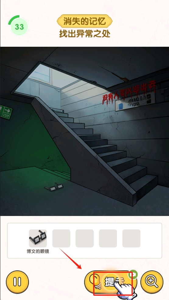 2、在楼梯间场景,点击右下角的“提示”按钮,获取寻找异常的线索。