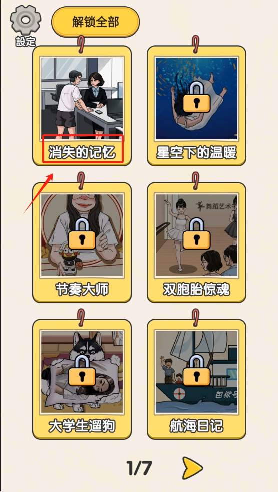 1、在关卡选择界面,点击左上角的“消失的记忆”关卡,进入游戏。