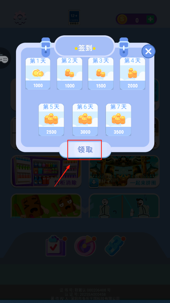 3、每日签到,点击“领取”按钮获取金币奖励。