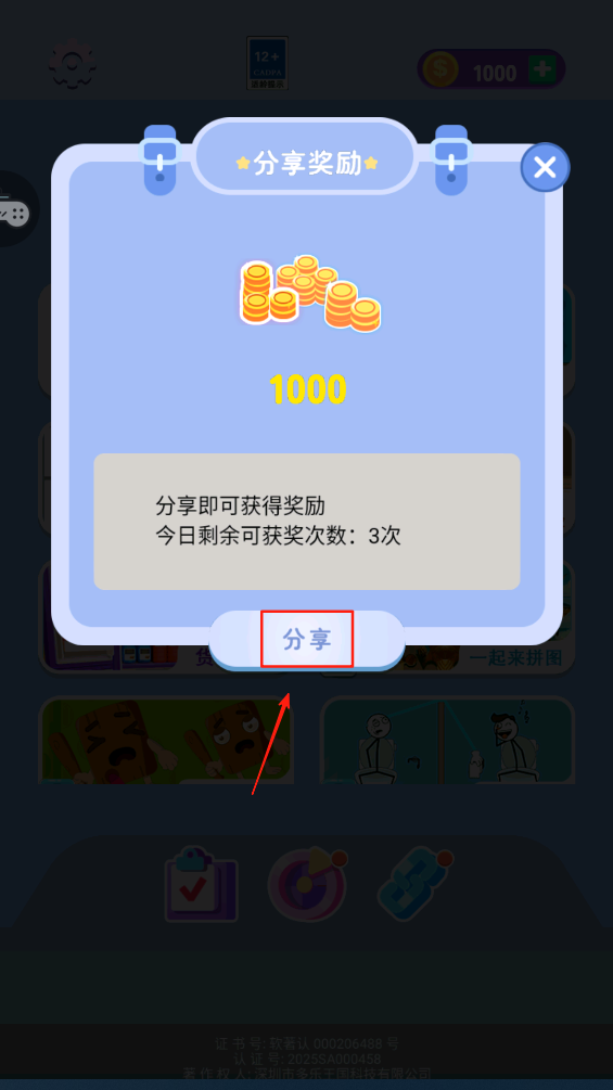 4、分享游戏,点击“分享”按钮获取额外金币奖励。