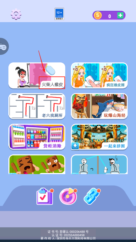 1、选择游戏,点击“火柴人橡皮”等游戏图标进入游戏关卡。