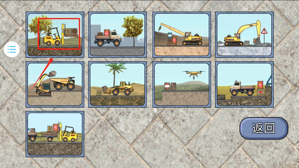1、挑选得力助手:根据关卡需求或自身兴趣,从14款施工车辆中选择最适合的工程伙伴投入建造。