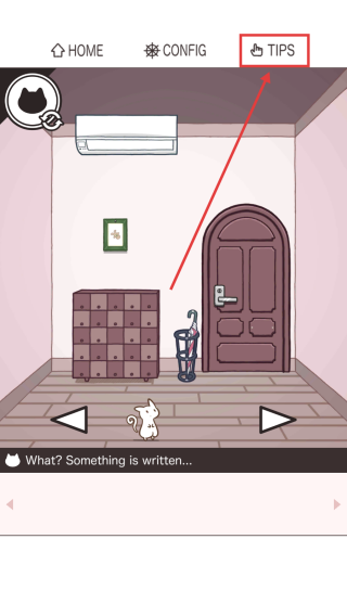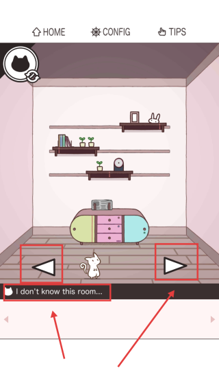 2、进入场景后,点击白色三角键切换场景,试着点击物品,可以通过猫咪的反应判断基本情况。