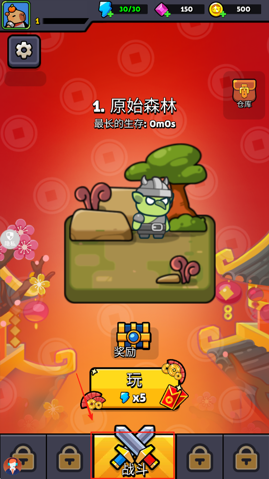 1、选择关卡“原始森林”,点击“玩”按钮并消耗5个宝石开始游戏。