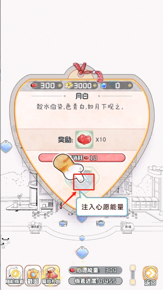 3、点击游戏中的“注入心愿能量”按钮,消耗相应心愿能量来完成心愿任务并获取奖励。