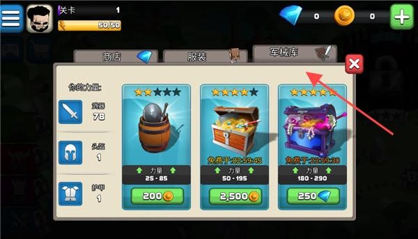 2、想要提升战斗力,先选择武器,新手玩家进入游戏,可以先免费选择装备宝箱。