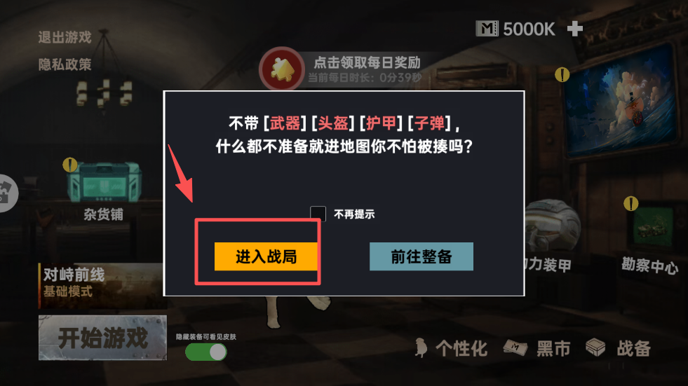 2、如果您未装备武器,系统会提示您,点击“进入战局”按钮,开始游戏前的装备准备。