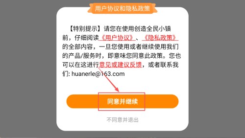 1、首次进入创造全民小镇会弹出用户协议与隐私政策,阅读后点击“同意并继续”即可进入游戏。