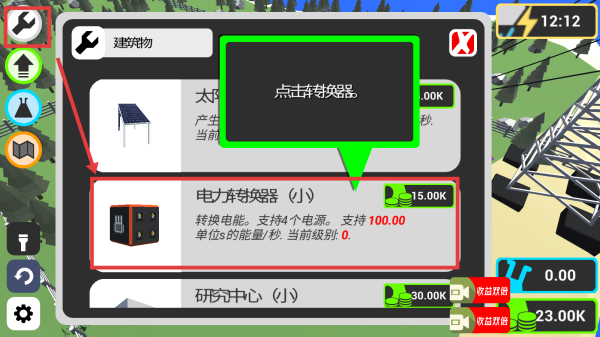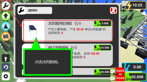 1、打开游戏,点击【建筑物】,再点击购买【太阳能电池板】,将其放置空地。